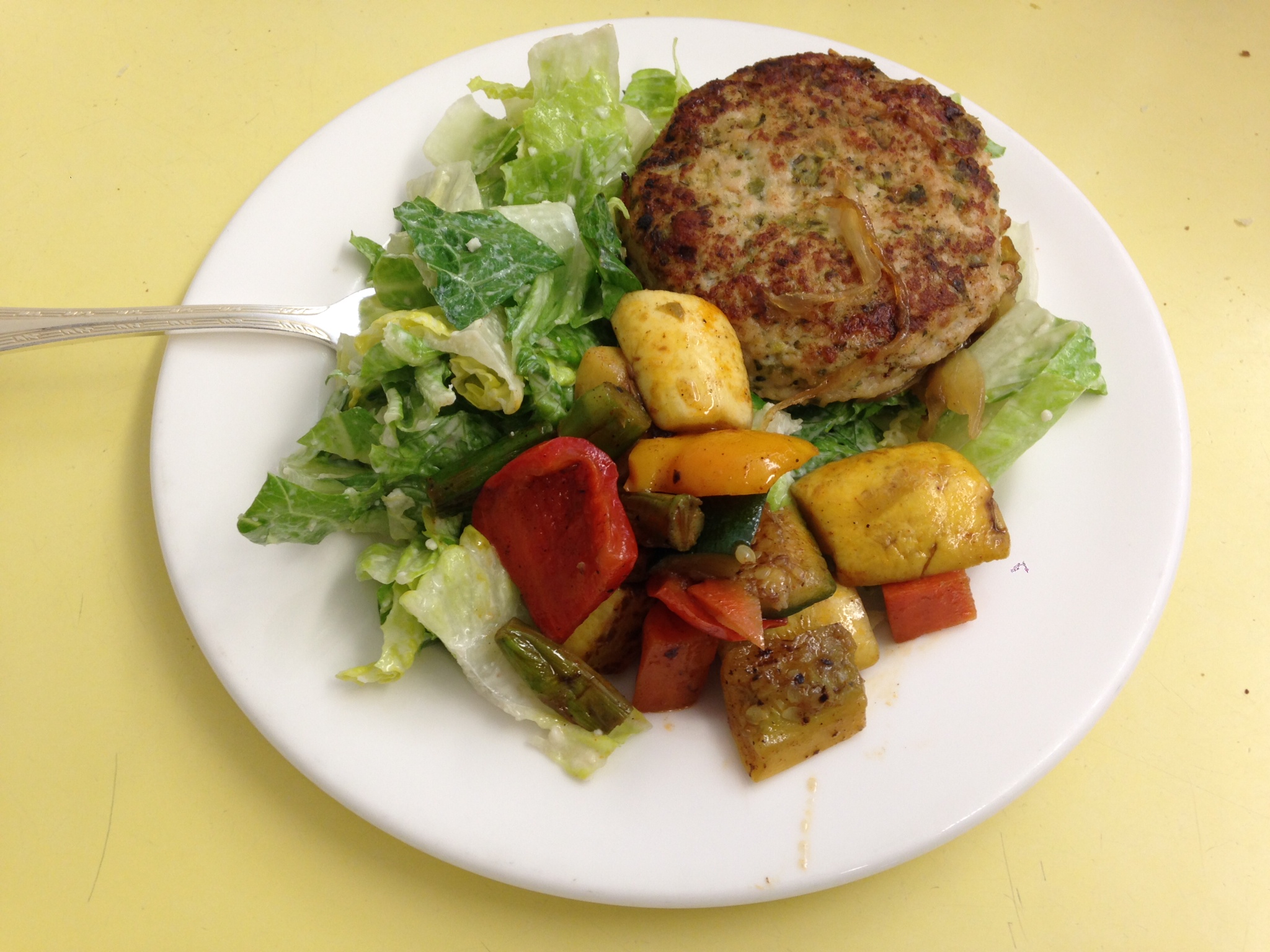Lunch: Salmon burger (no bun), roasted vegetables and salad with light dressing