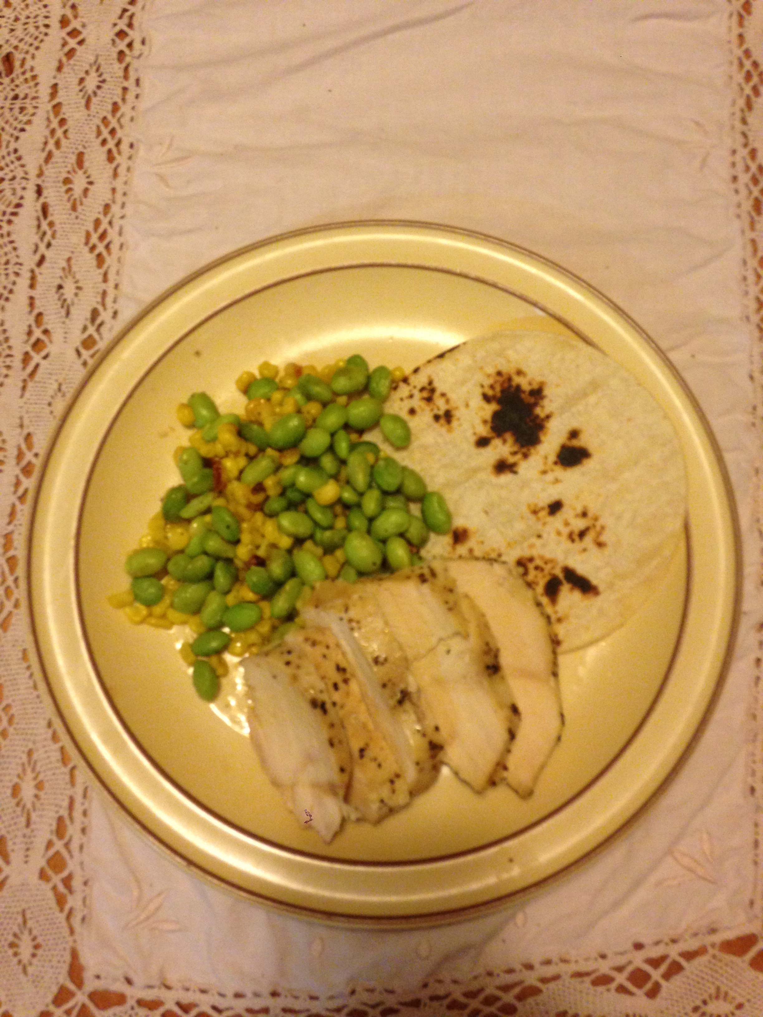 Dinner: lemon pepper chicken with 1 corn tortilla and 1 cup corn and edamame salad